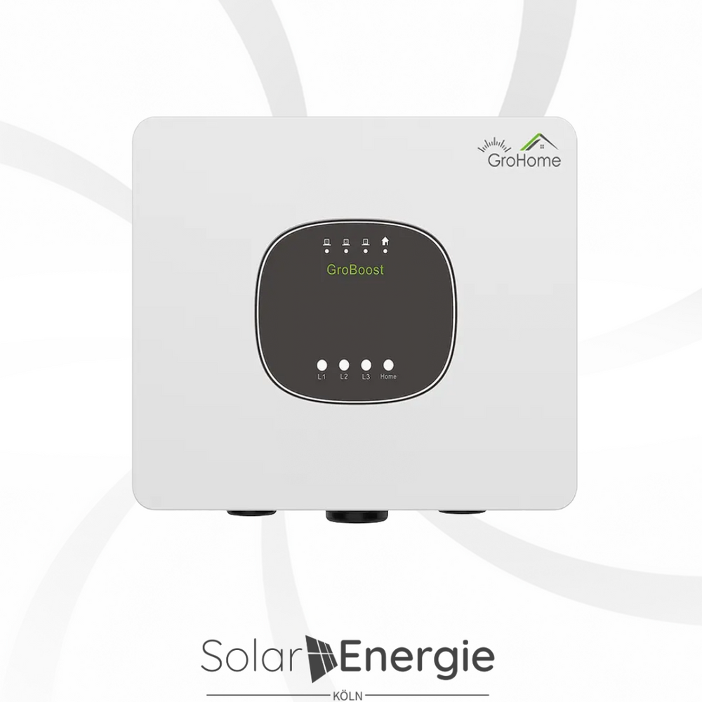 - Mit dem GroBoost ist eine einstellbare Leistungsregelung 0 - 10.8 kW möglich. Der GroBoost realisiert eine Drei-Zonen-Aufteilung mit drei unabhängigen Leistungsausgängen. Integriert in das Smart Home System erreicht der GroBoost eine Solar-Eigenverbrauchsquote bis zu 92%
